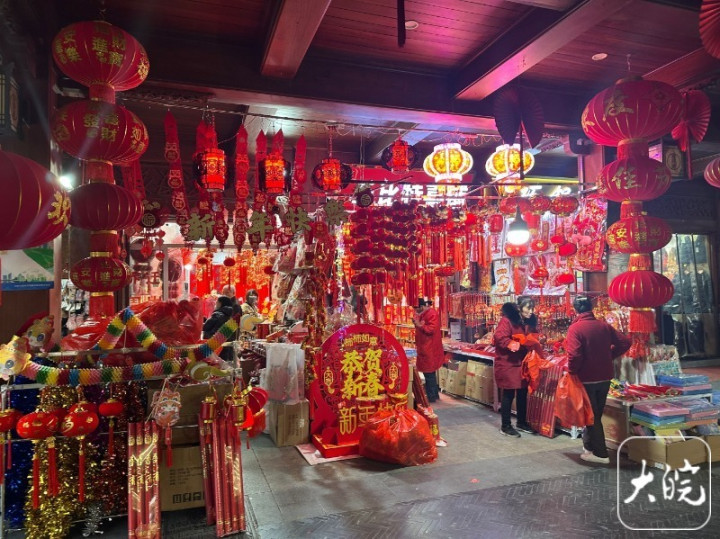 大红灯笼、中国结、福字、对联、年俗饰品等高挂,烘托出浓浓的喜庆氛围,引来不少顾客来选购年俗饰品。1月21日,大皖新闻记者在合肥城隍庙市场看到,这里一幅喜气洋洋的景象,目光所及之处都是喜庆的红色,悬挂待售的过年挂件小商品映红了整个街巷。除了对联福字、糖果糕点等传统年货,还有电子灯笼、智能玩具等新潮礼品一应俱全,人们穿梭于商铺之间,有的在货架前仔细挑选,有的拎着沉甸甸的袋子。