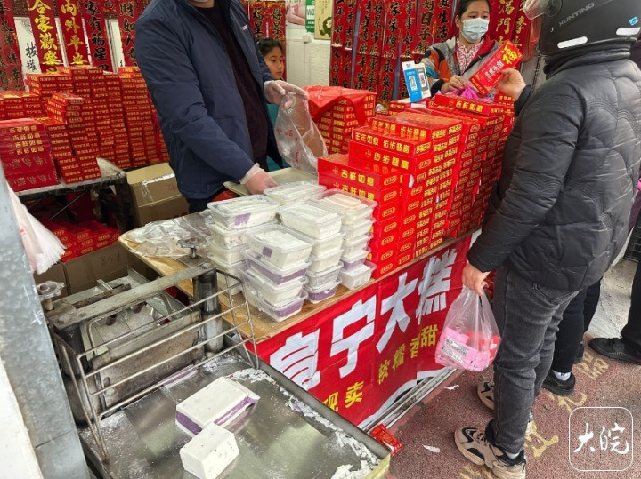 玉带糕因其层层重叠的造型与“步步高升”的寓意而格外受到追捧,也成了双岗老街里最为热销的年货之一。吴老板在老街卖玉带糕已经有十多年了,只见他家店门前排着长长的队伍,店前垒满了用红色卡纸包装好的玉带糕,一旁的切糕机在不停运作,将新鲜出炉的玉带糕分切整齐。吴老板一边给顾客打包一边告诉记者,“每年春节前这几天是卖得最好的时候,寓意好,‘步步高’,很多市民都会买上几盒。”